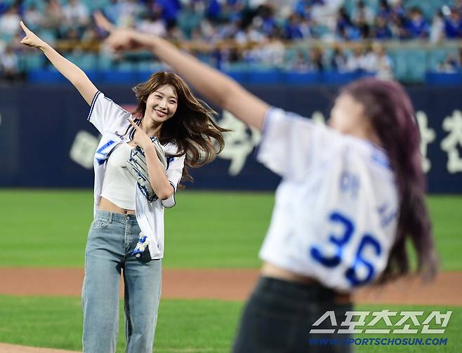 23일 대구 삼성라이온즈파크에서 열린 KBO리그 삼성과 두산의 경기. 걸그룹 '에버글로우' 멤버 시현, 아샤가 시구-시타를 했다. 시구, 시타를 마치고 세리머니는 펼치고 있는 시현, 아샤. 대구=송정헌 기자songs@sportschosun.com/2025.09.23/
