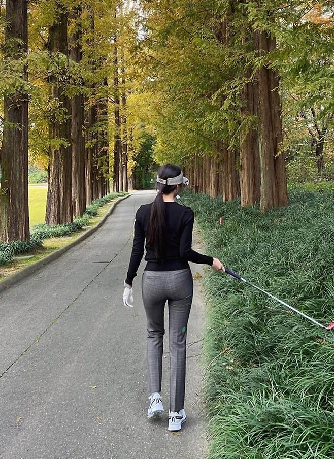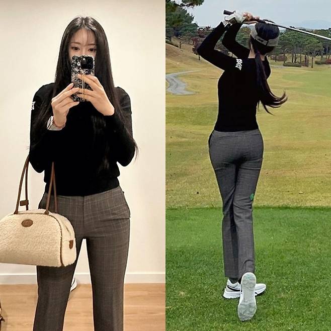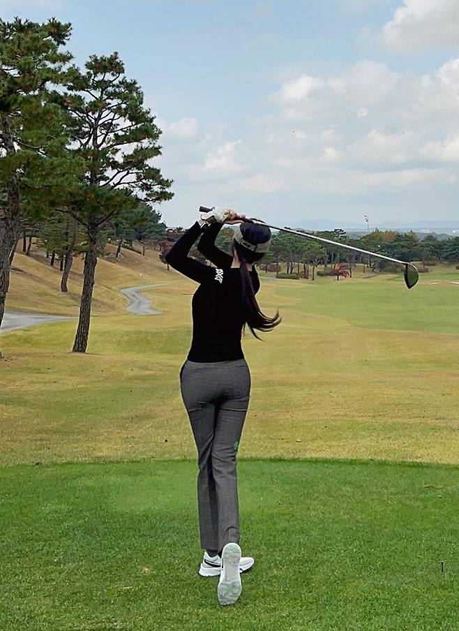공개한 사진에서 효민은 체크 패턴의 슬림한 팬츠에 블랙 티셔츠를 착용한 가을 골프룩으로 건강하면서도 아름다운 뒤태미를 뽐냈다.