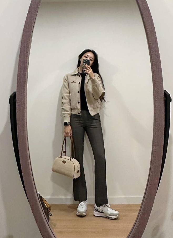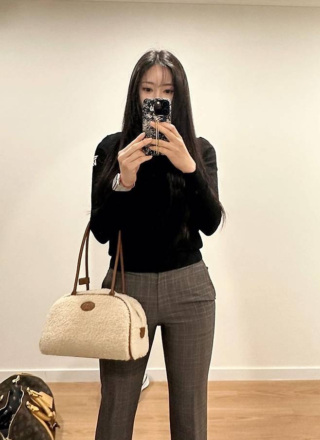 티아라의 효민이 슬림 체크 팬츠의 가을 골프룩으로 아름다운 뒤태미를 뽐냈다.