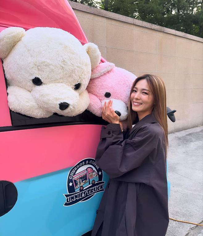 대형 곰인형과 함께한 선예는 그레이 오버사이즈 셔츠로 편안하면서도 트렌디한 스타일을 선보이고 있다. 루즈한 핏의 셔츠가 자연스러운 실루엣을 만들어내며, 미니멀한 디자인으로 세련된 일상복 스타일링을 완성하고 있다.