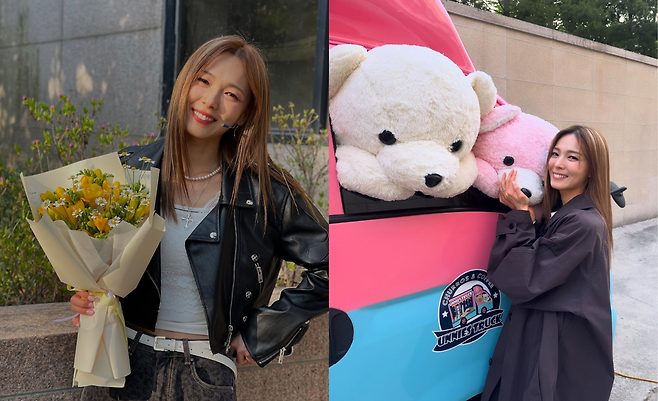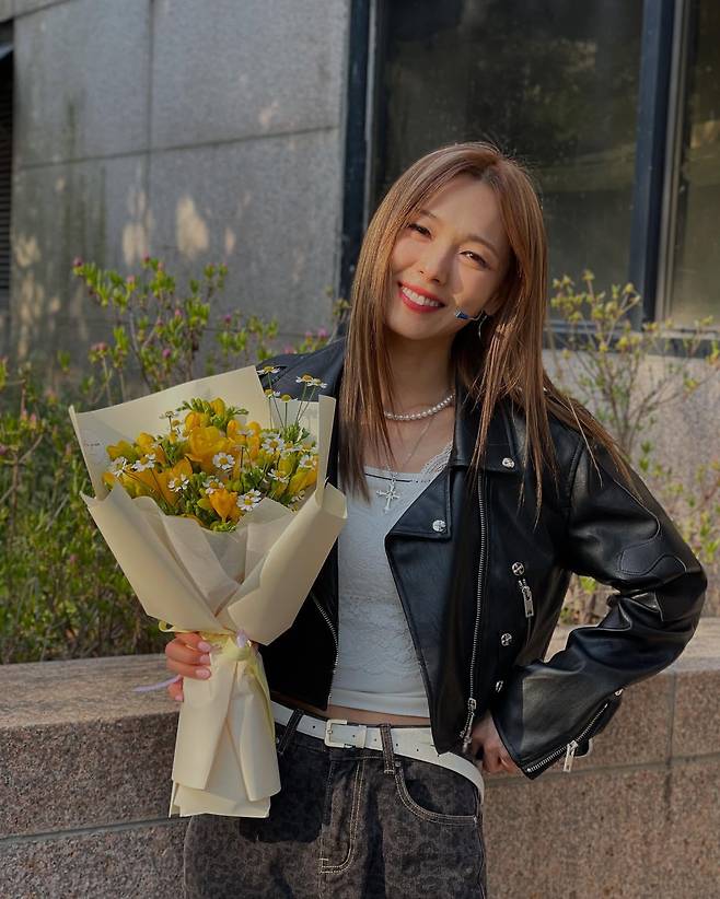 노란 꽃다발을 든 선예는 블랙 레더 재킷과 데님 팬츠로 캐주얼한 매력을 발산하고 있다. 화이트 크롭 톱 위에 레이어드한 레더 재킷이 에지있는 분위기를 자아내며, 펄 목걸이가 여성스러운 터치를 더해 완벽한 밸런스를 이루고 있다.