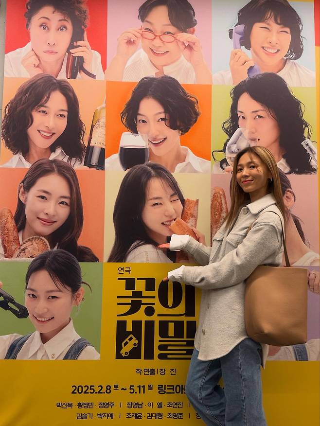연극 포스터 앞에서 포즈를 취한 선예는 베이지 컬러의 코트와 데님으로 차분하고 세련된 룩을 연출하고 있다. 뉴트럴 톤의 아우터가 깔끔한 인상을 주며, 심플한 액세서리로 미니멀한 감성을 표현하고 있다.
