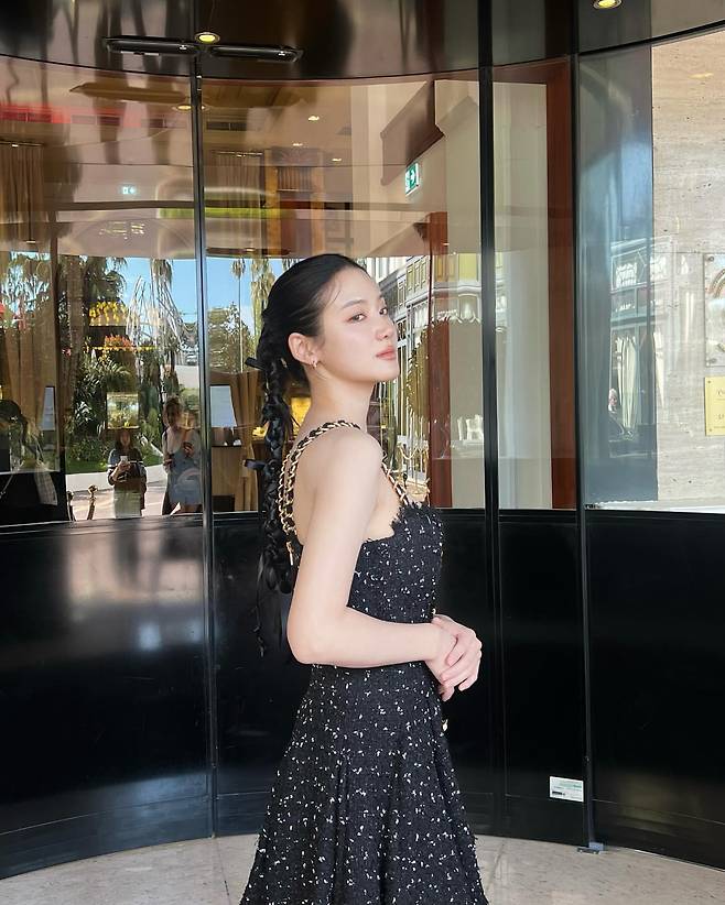 고급스러운 블랙 드레스로 우아함을 뽐내고 있는 박주현의 모습이다. 골드 체인 스트랩 디테일이 돋보이는 블랙 트위드 드레스는 클래식한 디자인에 모던한 감각을 더했다. 긴 땋은 헤어스타일과 함께 연출한 이 룩은 세련된 파티 웨어로서 박주현의 고급스러운 이미지를 한층 돋보이게 하고 있다.