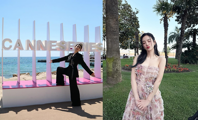 칸 영화제를 배경으로 박주현이 모던한 블랙 수트 룩을 선보이고 있다. 화이트 스티치 디테일이 돋보이는 블랙 테일러드 수트는 클래식한 디자인에 현대적인 감각을 더했다. 와이드 팬츠와 함께 연출한 이 룩은 세련된 비즈니스 캐주얼 스타일로, 해변가의 'CANNES' 조형물과 함께 글로벌 스타로서의 면모를 드러내고 있다.