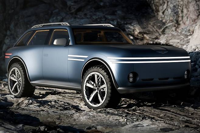 특히 긴 후드와 세련된 캐빈, 가파른 C-필러는 기존 SUV에서 볼 수 없는 독특한 실루엣을 완성하였으며, 위아래로 나뉘어 열리는 후면부의 분할 개폐식(split-opening) 테일게이트는 제네시스의 시그니처 투라인 헤드램프와 조화를 이루어 실용성과 디자인을 동시에 만족시켰다.