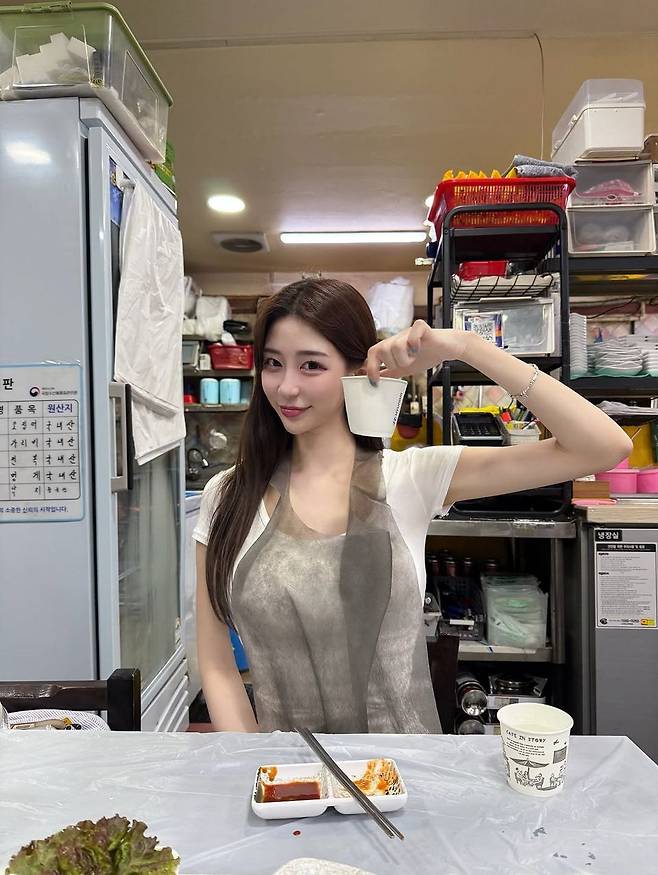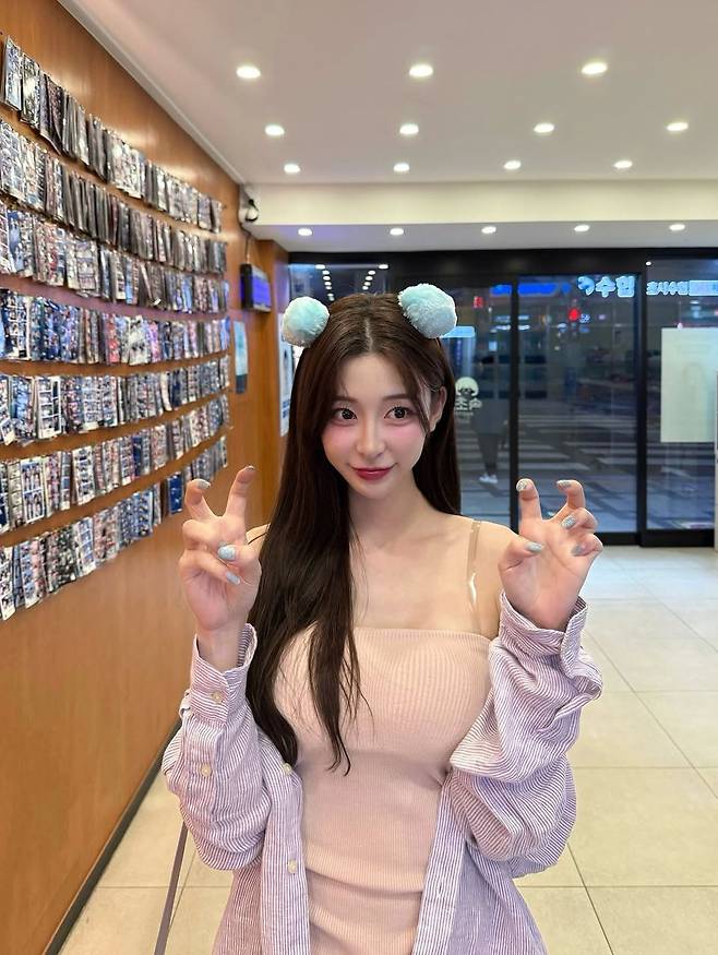 특히 민트빛 퍼 머리띠와 귀여운 고양이 포즈는 한여름의 덕질 감성을 완성한다. 헤어 액세서리는 마치 2000년대 초반 '캔디 펑크' 감성을 재현하듯 톡톡 튄다. 실내 조명이 반사된 볼터치 메이크업은 인형 같은 이미지를 더욱 부각시키며, 사랑스러운 오로라 무드를 연출한다.