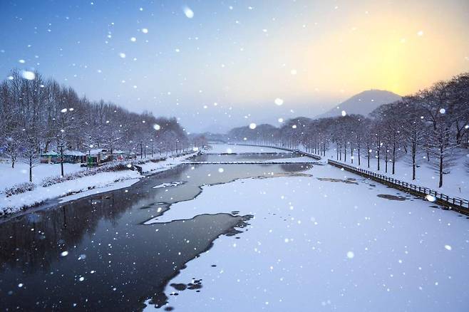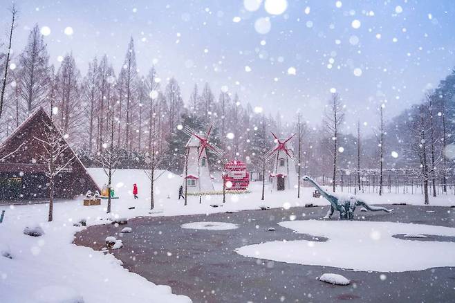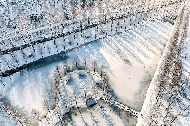 입장 후의 추천 동선은 메타세쿼이아 숲길의 가장 촘촘한 가로수 구간을 중심으로 천천히 30~40분 정도 걷는 방식입니다. 눈이 내린 날은 특히 바닥에 눈이 쌓인 뒤 첫 발자국을 찍을 때 길 전체의 고요함을 더 뚜렷하게 느낄 수 있고, 오후 늦게 햇빛이 길게 드리울 때는 나무 그림자가 설경 위에 규칙적으로 늘어서 독특한 풍경을 만들어냅니다.