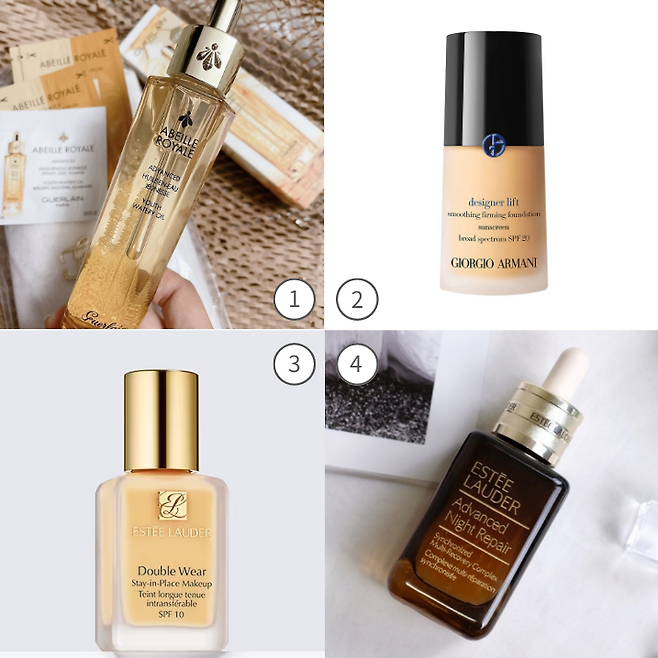 이외에 면세점 직원들의 추천 베이스 제품으로는 2)'아르마니 디자이너 리프트 파운데이션'과 3)'에스티 로더 더블 웨어 파운데이션', 4) '에스티 로더 어드밴스드 나이트 리페어 싱크로나이즈드 멀티-리커버리 콤플렉스'등이 있습니다.
