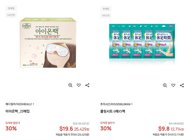하루의 피로를 풀어줄 찜질팩도 인기 있는 품목 중 하나인데요. 여행 도중 요긴하게 쓸 수 있다는 장점이 있죠. '메디힐리의 아이온팩'과 ' 휴족시간 쿨링시트'는 30% 할인된 가격으로 구매할 수 있으니 참고하시길 바랍니다.