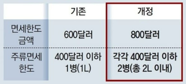 주류 면세 한도는 400달러에 1병(1L)까지였으나 2병(2L)으로 변경되었습니다. 이전에는 150달러짜리 1병을 구매하면 나머지 금액을 쓸 수 없었지만 이제 2병도 구매할 수 있습니다.