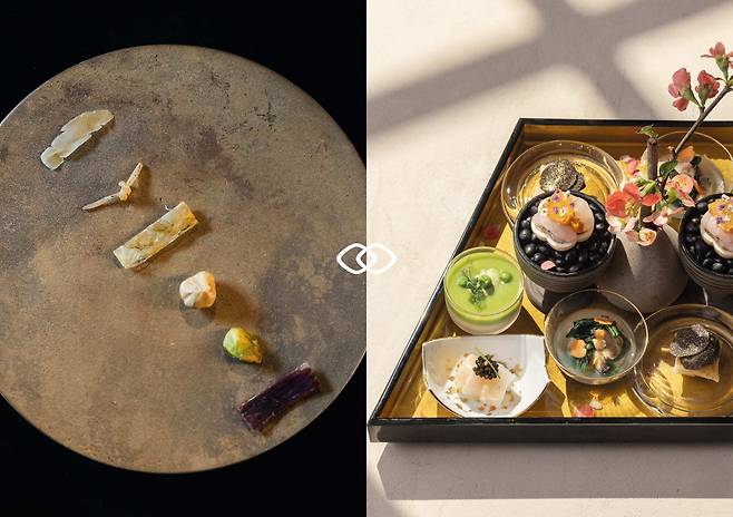 갈라 디너는 윤서울과 미오의 시그니처 메뉴와 셰프들이 함께 구성한 메뉴가 어우러진 10코스로 구성된다. 먼저, 에피타이저로 윤서울의 ‘한입 거리’로 시작해 미오의 자연산 사시미와 대게 맑은국이 갈라 디너의 첫인상을 전한다. 이어서 윤서울의 ‘각색어채’와 미오의 시그니처 메뉴이자, 계절 요리를 한 접시에 담아낸 ‘핫슨(Hassun)’이 조화를 이룬다. 메인 요리로 윤서울의 시그니처 메뉴인 면 요리와 미오의 죽순을 곁들인 1++ 한우 부채살이 이어진다.