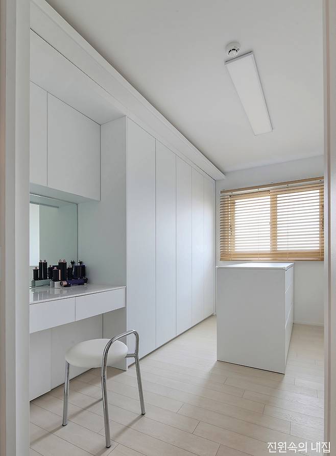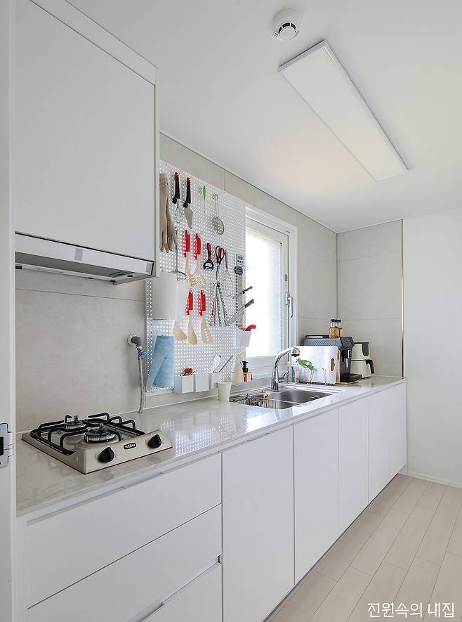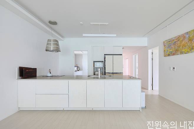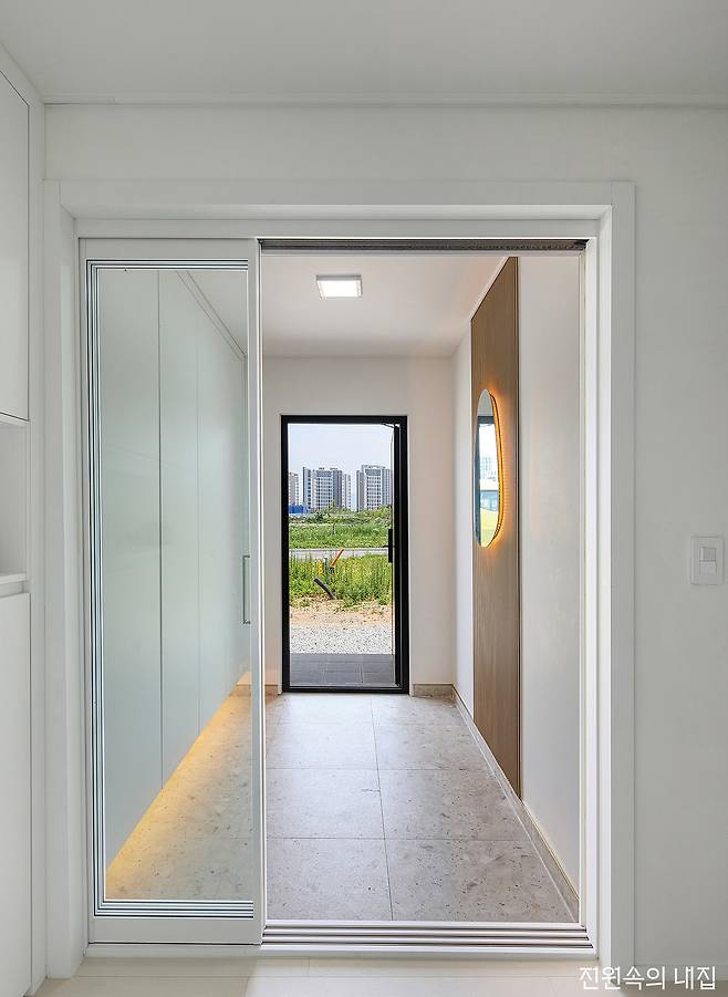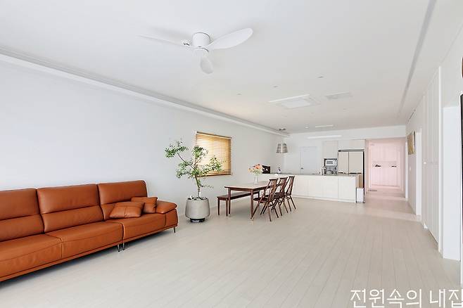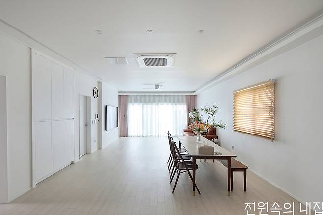 기다란 대지를 따라 그린 듯 얹어진 집으로 들어서면 일자로 쭉 뻗은 복도를 줄기 삼아 각각의 공간이 이어진다. 여기에 심플한 화이트와 목재의 물성이 주를 이루는 인테리어까지, 건축주가 그려둔 청사진을 실내에 그대로 재현해 냈다. 긴 직선의 구조를 통해 거실과 주방은 마주 보며 아이가 마음껏 뛰어놀 수 있을 정도로 넓게 전개된다.