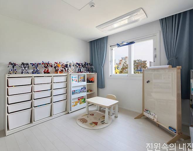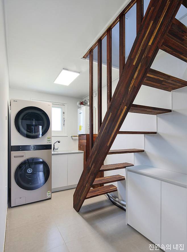 실내에는 여러 생활의 편의를 위한 공간들도 함께 녹여냈다. 주방 뒤로 이어지는 보조 주방은 깔끔한 수납과 더불어 조리 공간을 한 번 더 분리해 준다. 또 세탁실 위로 계단과 함께 다락형 창고를 구성해 크고 작은 짐들을 보관할 수 있게 했다. 아이의 침실과 놀이방은 현재는 벽으로 분리되어 있지만, 좀 더 자라면 더 넓은 방을 가질 수 있도록 초기부터 계획한 부분이다.