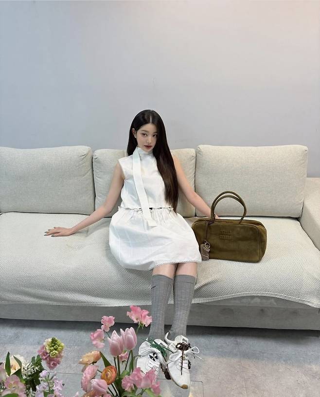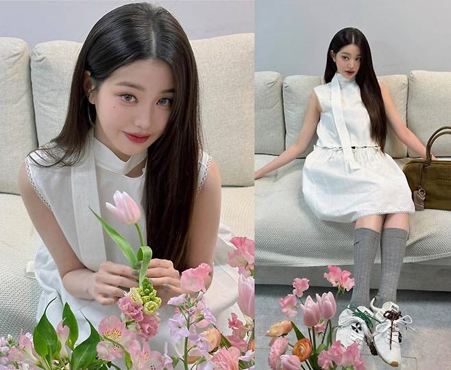 장원영이 화사한 플라워 무드 속에서 러블리한 화이트 룩으로 시선을 사로잡았습니다.