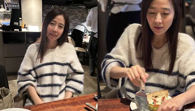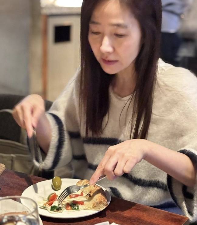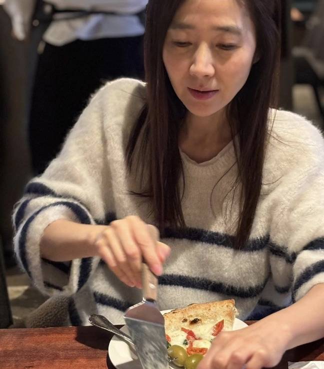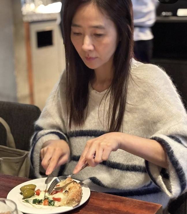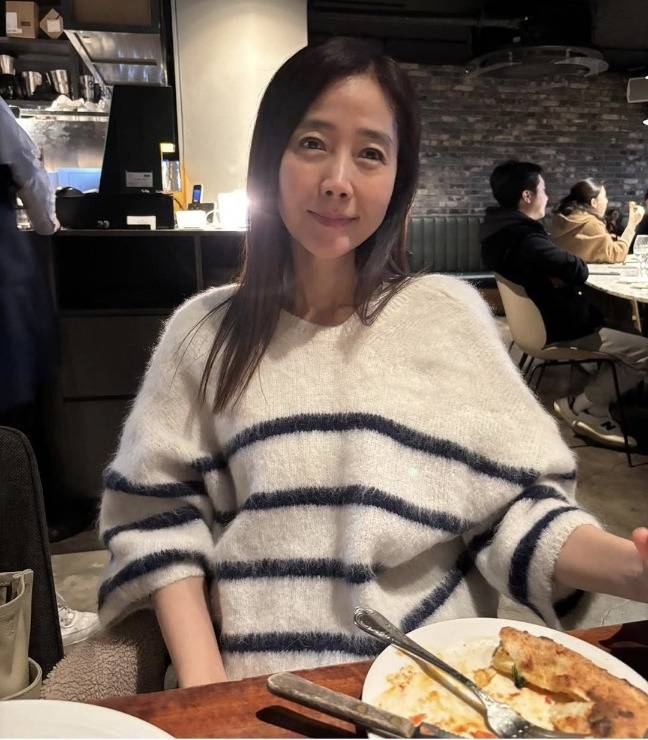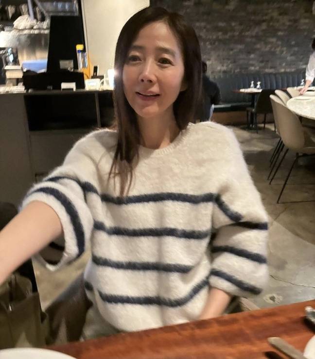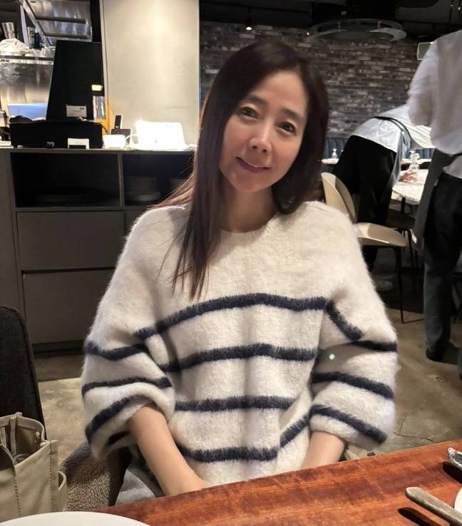 강수지는 부드러운 질감의 니트 톱을 선택해 편안하면서도 포근한 분위기를 연출했으며, 스트라이프 패턴이 더해져 경쾌한 포인트를 주었습니다.