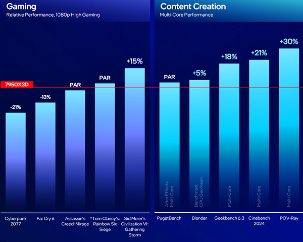현존하는 최강의 게이밍 CPU인 라이젠 9 7950X3D와 비교하면 사이버펑크 2077같은 3D 오픈월드 고사양 게임에서는 불리하지만 문명6에서는 월등히 앞서며, 콘텐츠 제작 생산성 앱에서는 최대 +30%에 달하는 차이를 냅니다.