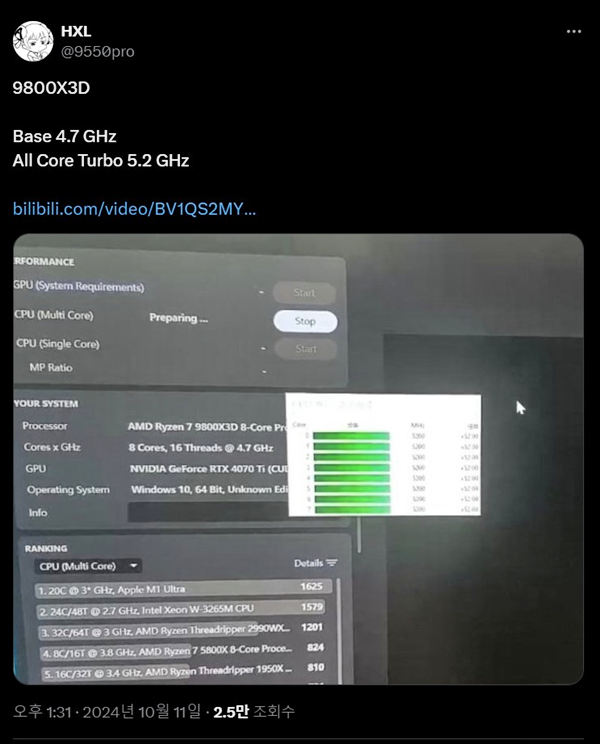 이번에 라이젠 7 9800X3D의 시네벤치 테스트 과정이 일부 유출됐습니다. X(구 트위터)에서 활동 중인 HXL(@9550pro)가 중국에서 퍼온 이미지를 올렸는데요. 원 출처는 중국판 유튜브인 빌리빌리의 한 영상입니다.