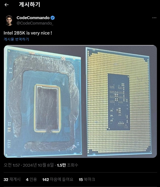 인텔의 공개에 앞서 코어 울트라 285K를 뚜따한 이미지가 유출됐습니다. 이미지를 보면 코어 주변을 둘러싼 접착제가 꽤 넓은 면적을 차지하고 있는데요, 이거 뚜따 난이도가 상당히 높아 보입니다. 다이와 코어는 세로로 길죽한 직사각형 형태가 맞네요.