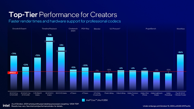 고해상도 미디어 가속에서는 여전히 강세입니다. 라이젠 9 9950X와 비교할 경우 5.7K, 8K 초고해상도 미디어 인코딩, 렌더링 등에서 월등히 앞서는 모습을 보여줍니다.