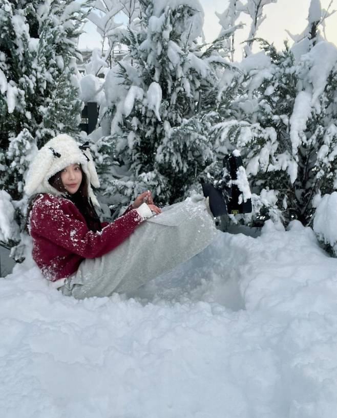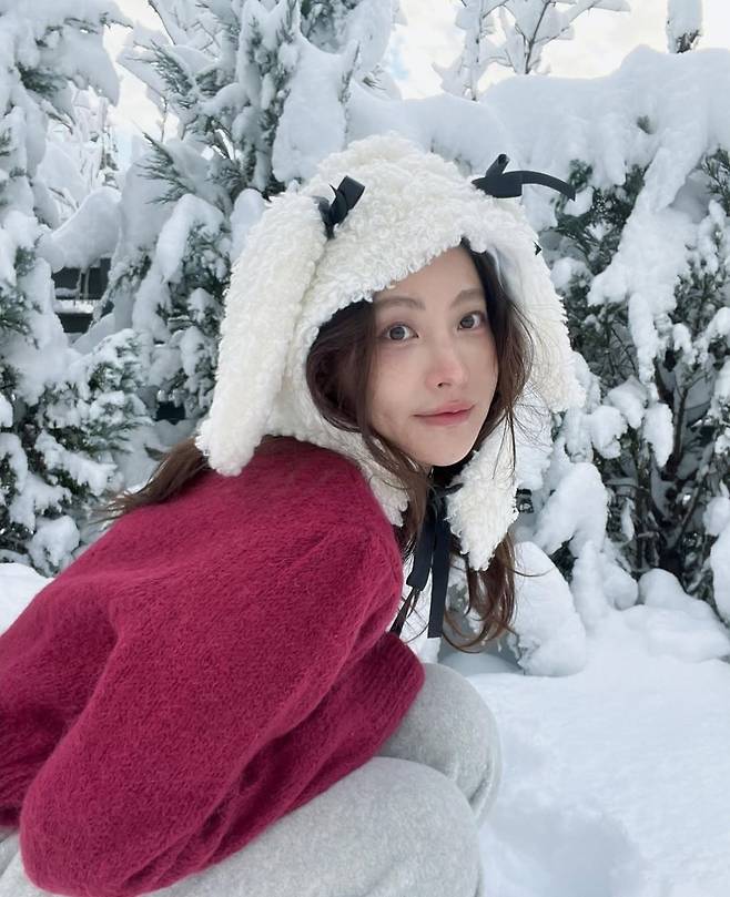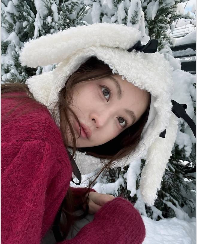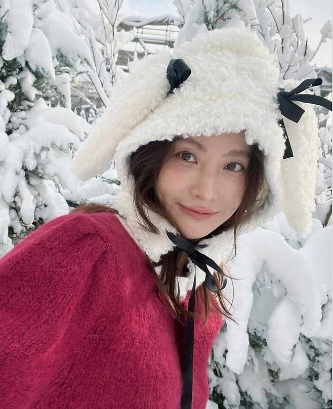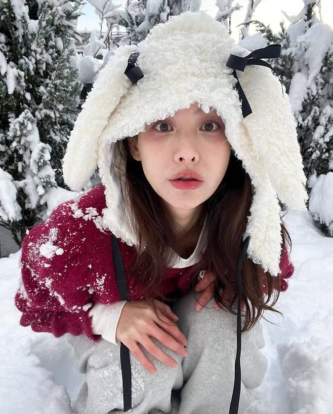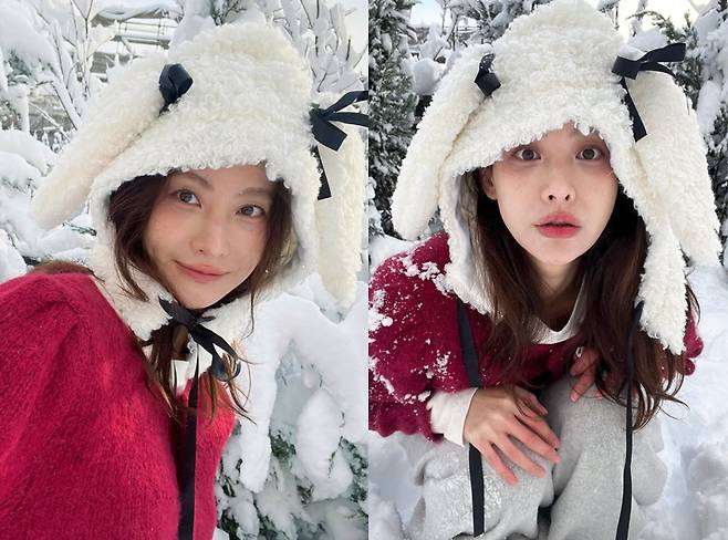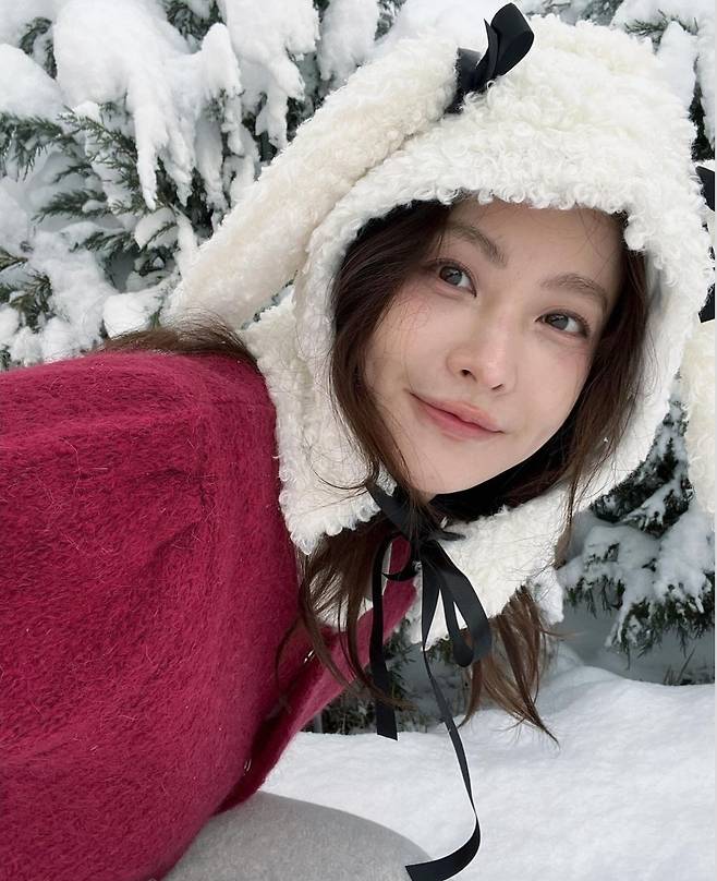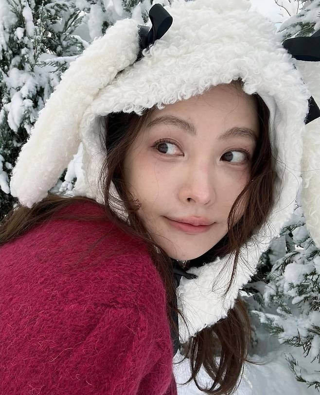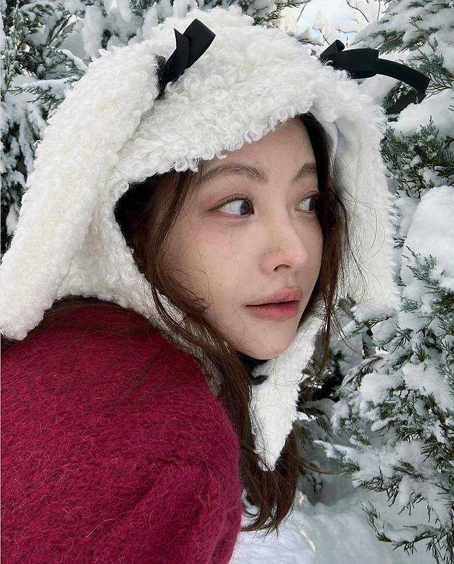오연서는 눈 덮인 겨울 풍경을 배경으로 양쪽에 귀를 달아놓은 듯한 독특한 플리스 모자를 착용해 사랑스럽고 포근한 분위기를 연출했습니다.