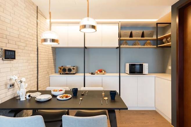 맞춤형 어두운 톤의 도자기 식탁과 금속 프레임 다리는 고객 맞춤형 디자인의 정점을 보여준다. 천장에 매입된 조명과 메탈 펜던트 조명이 식사 공간의 분위기를 조성한다. 주방 옆 벽면은 자석 페인트와 칠판 페인트가 덧입혀져 실용성과 감성을 모두 만족시킨다.