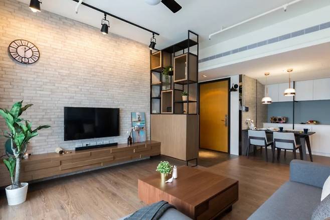 거실은 전반적으로 뉴트럴 톤이 주를 이루며, 다양한 소재가 어우러져 공간에 생동감을 더한다. 텍스처가 돋보이는 벽돌 타일이 TV 벽을 장식하고, 그 아래에는 깔끔한 우드 선반이 이어진다.