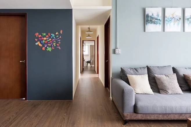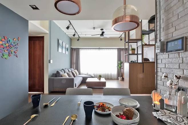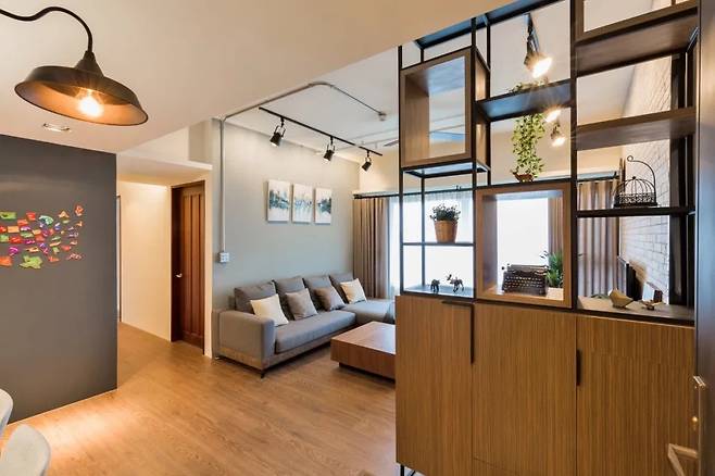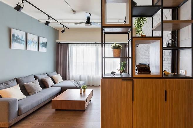 이 선반은 단순한 수납 기능을 넘어 조형적인 역할을 수행한다. 회색 소파와 파란빛이 더해진 벽면, 메탈 소재의 노출된 요소가 함께 어우러져 공간에 리듬을 더한다. 특히 샌드블랙의 EMT 배선과 철제 스프링클러 노출 디자인은 공간에 활력을 더한다.