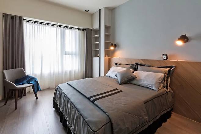 침실은 전체적으로 차분하고 따뜻한 분위기를 자아낸다. 좌우 협탁 대신 두꺼운 통합형 헤드보드를 사용하였고, 여기에 메탈 소재의 벽등을 설치하여 감각을 높였다. 창가에 위치한 양면 수납장은 소장품을 노출시키면서 가림막 역할을 한다.
