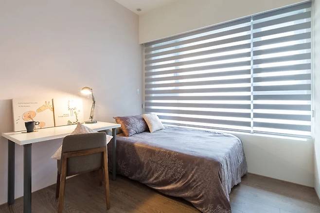 TV와 붙박이장은 일체형으로 설계되어 미니멀한 느낌을 유지하면서도 수납 공간을 놓치지 않았다. 책상과 책장은 밝은 색상으로 마감되어 공간의 균형을 고려했고, ‘ㄱ’자 형태의 오픈 드레스룸은 실용성과 디자인을 모두 만족시켰다.