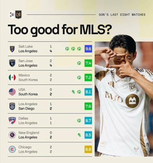솔트레이크전만의 일이 아니다. 손흥민은 LAFC 데뷔전부터 후반 교체 출전해 페널티킥을 얻어내더니 이후로도 환상적인 프리킥 데뷔골을 신고하며 존재감을 뽐내고 있다. MLS도 "손흥민이 '블랙 앤 골드(LAFC 애칭)'에서 출전한 첫 6경기 기록은 이제 5골 1도움에 달한다. LAFC는 8월 초 그가 팀에 합류한 뒤 경기당 2.33골을 터트리며 3승 2무 1패를 기록했다"라고 강조했다.