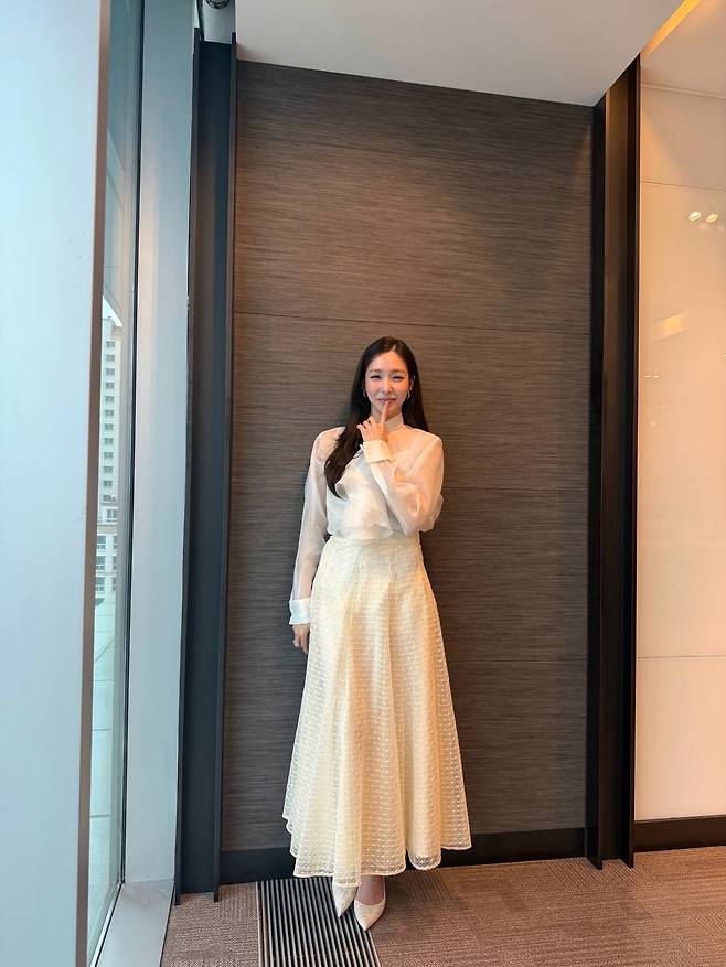 시선을 사로잡는 화이트 시스루 블라우스를 메인 아이템으로 선택해서 시각적으로 매우 깨끗하면서도 신비로운 인상을 줍니다.