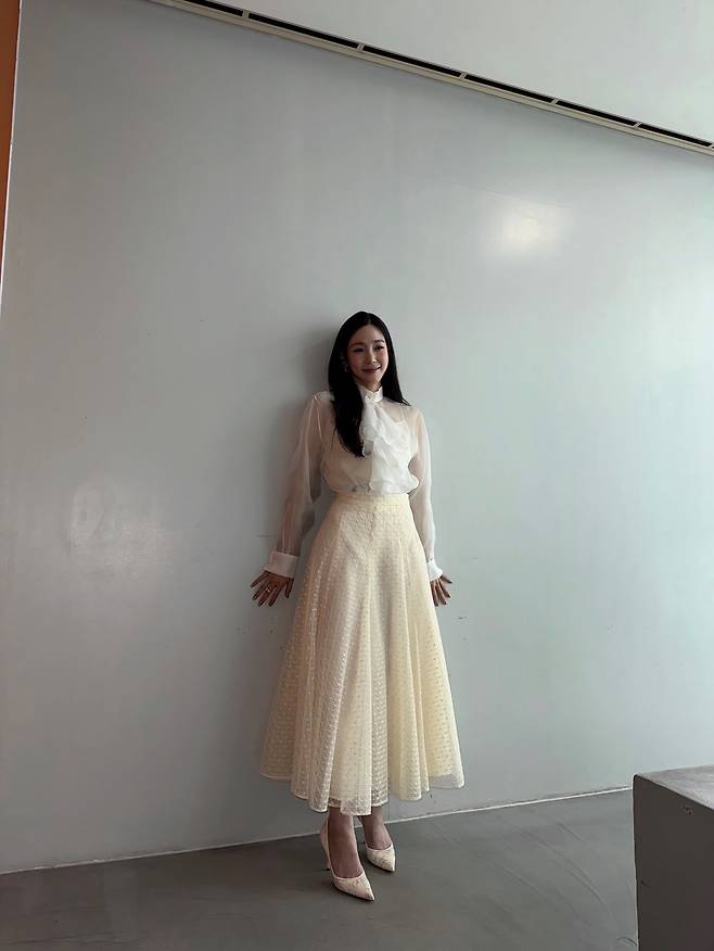 얇은 비침이 있는 블라우스 안으로 깔끔한 슬립을 받쳐 입어 절제된 섹시미를 연출하는 동시에, 하의로는 탄탄한 조직감이 느껴지는 아이보리색 스커트를 매치해 상의의 가벼움과 안정적인 균형을 맞췄죠.