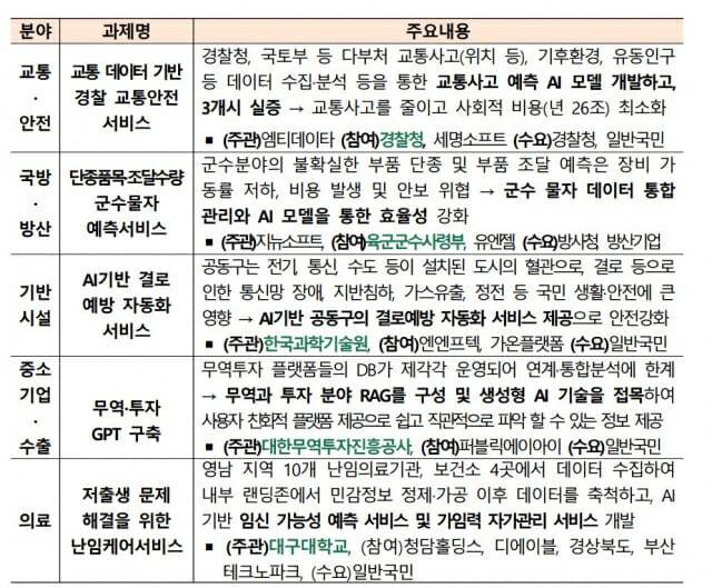 둘째, ‘데이터레이크 활용지원’은 민간 클라우드 기반의 ‘DPG 데이터레이크’를 활용해 분야별 데이터를 축적하고 가공·분석·AI 모델링 등을 통해 혁신서비스를 창출하는 사업으로, 올해는 우선 5개 분야(의료·복지, 국방·방산, 교통안전, 기반시설, 수출·중소기업)별 컨소시엄을 선정해 저출산 난임케어, 교통사고 예방, 중소기업 수출지원 등의 서비스를 개발 및 실증하고, 내년에는 분야를 확대할 예정이다. 5개 선정과제는 ▲경찰청 교통안전서비스 ▲군수물자 예측서비스 ▲AI기반 공동구 결로 예방서비스 ▲무역·투자GPT ▲저출생해결 난임케어서비스 등이다. (맨 아래에 이미지)