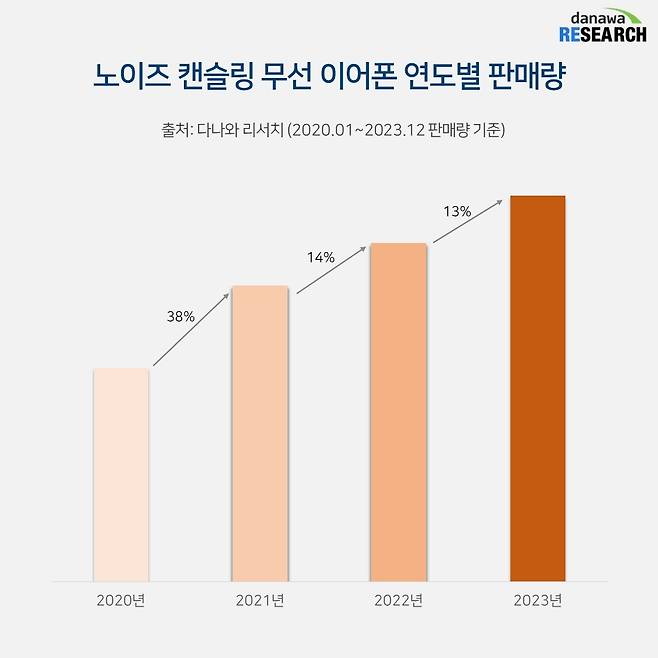 사실 '전체 무선 이어폰'시장은 침체된 형국이다. 2023년의 판매량이 2020년 대비 30.7%나 낮아 진 것. 그럼에도 불구하고 '노이즈 캔슬링 무선 이어폰'은 매년 잘 나가고 있다. 해마다 평균 21.7%씩 판매량이 증가하는 것. 또한 전체에서 노이즈 캔슬링 제품이 차지하는 비율은 2020년 23%에서 2023년 61%로 급상승했다. 이정도면 노이즈 캔슬링 무선 이어폰이 확실한 대세라고 단언할 수 있다.