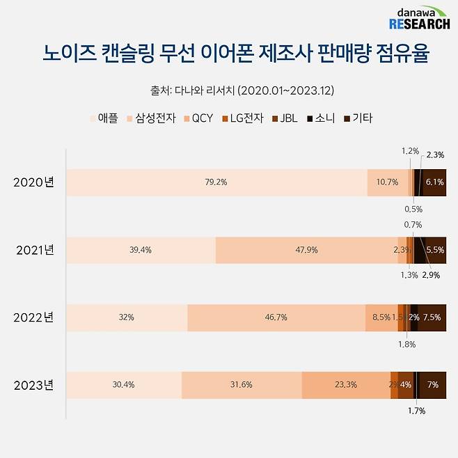 노이즈 캔슬링 무선 이어폰 시장은 애플이 열었다. 2019년 말에 에어팟을 출시한 애플은 2020년 국내 노이즈 캔슬링 무선 이어폰 시장에서 점유율 79%를 차지했다. 다른 주요 제조사에서 노이즈 캔슬링 제품을 출시하지 않은 선점 효과가 크긴 하지만 에어팟 프로 1세대의 소비자 반응은 뜨거웠다. 30만 원대의 높은 가격에도 불구하고 노이즈 캔슬링 성능과 착용감이 우수해 좋은 평가를 받았다. 2020년 79%로 정점을 찍고 매년 점유율이 떨어지고 있는데 최근 1년 6개월 가까이 신제품이 없기 때문으로 보인다.