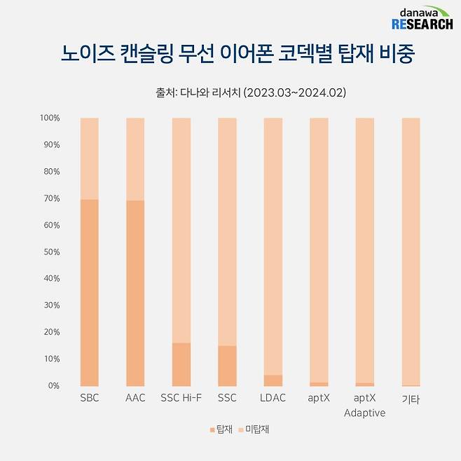다나와 리서치에서 최근 1년간 노이즈 캔슬링 무선 이어폰 오디오 코덱별 탑재 비중을 알아봤다. 오디오 코덱은 사운드에 큰 영향을 끼치는 요소인데 SBC, AAC 같은 기본적인 오디오 코덱이 압도적으로 높았다. 반면에 LDAC, aptX 같은 고음질 코덱은 탑재율이 한 자릿수를 기록할 정도로 저조했다.