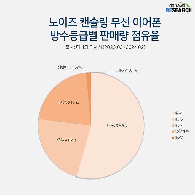 지난 1년간 다나와 리서치 데이터로 방수 등급별 판매량 점유율을 보면 IPX4 등급이 1위를 차지하고 있다. 방수 등급은 0부터 8까지 있는데 그중에서 4등급은 모든 방향에서 분사되는 액체로부터 보호해 주는 수준을 말한다. 이는 비를 맞으면서 사용할 수 있는 정도를 뜻한다. 이론상으로는 IPX7부터 수영이나 샤워하면서 사용은 가능하지만 삼성전자를 비롯한 주요 제조사에서는 권장하지 않고 있다.