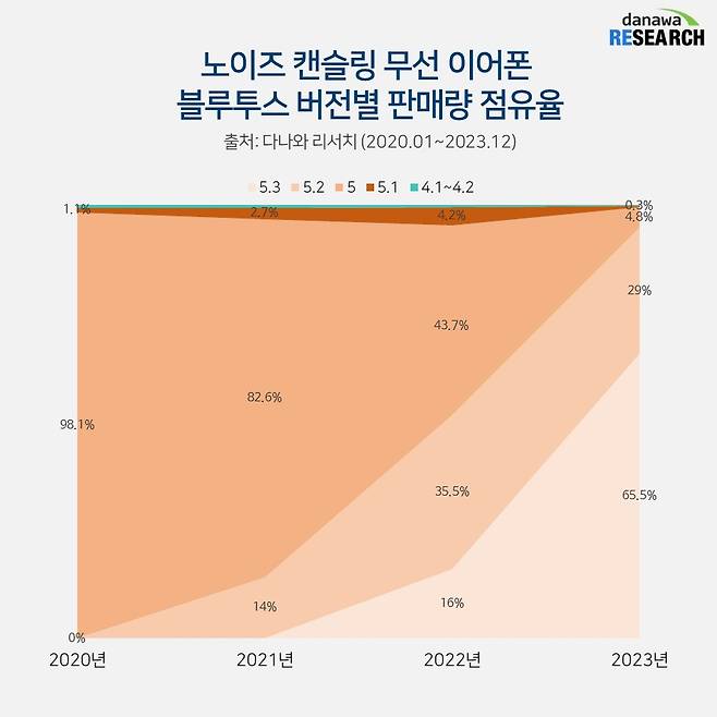 연도별 노이즈 캔슬링 무선 이어폰 블루투스 버전별 판매량을 살펴보면 트렌드 변화가 빠르다는 점을 발견할 수 있다. 2020년 블루투스 버전 5.0은 98.1%로 제일 높았으나 2023년에 와서는 4.8%로 급격히 줄어들었다.