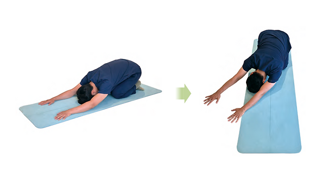 무릎을 꿇고 바닥에 앉은 다음 두 팔을 머리 위로 들어 앞으로 쭉 뻗어줍니다.