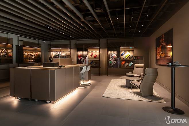 실내 전반에 이탈리아의 구시가지를 연상시키는 흙빛 톤의 컬러를 적용했으며 이탈리아의 하이엔드 가구 브랜드 '까시나 커스텀 인테리어(Cassina Custom Interiors)'가 디자인한 현대적인 가구와 진열장으로 고급감을 극대화했다. 벽면 진열장은 은은한 조명으로 휠 캡과 스티어링 휠을 보석처럼 비추며, 최고급 수공예 가죽 샘플도 만나볼 수 있다.