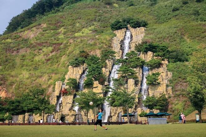 사계절 정원, 잔디광장, 어린이놀이터 등 다양하게 힐링하기 좋으며, 특히 65m 높이에 최대 너비 95m의 채석장 절개 부지에서 떨어져 내리는 인공폭포가 인상적인데요.