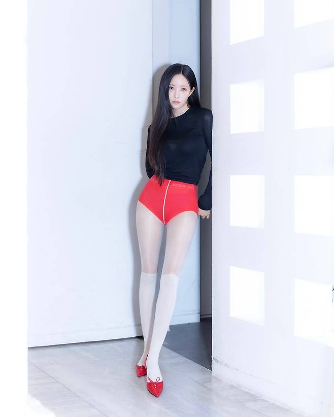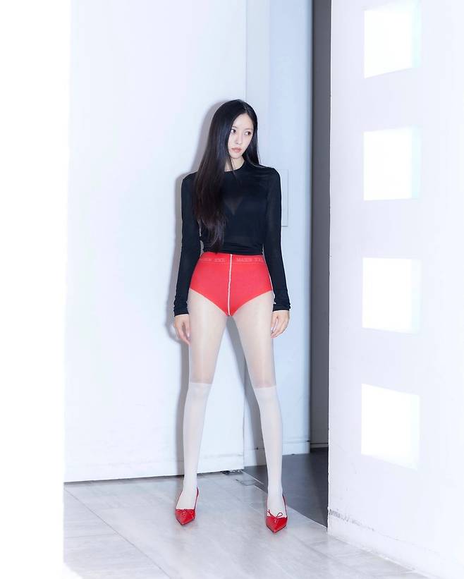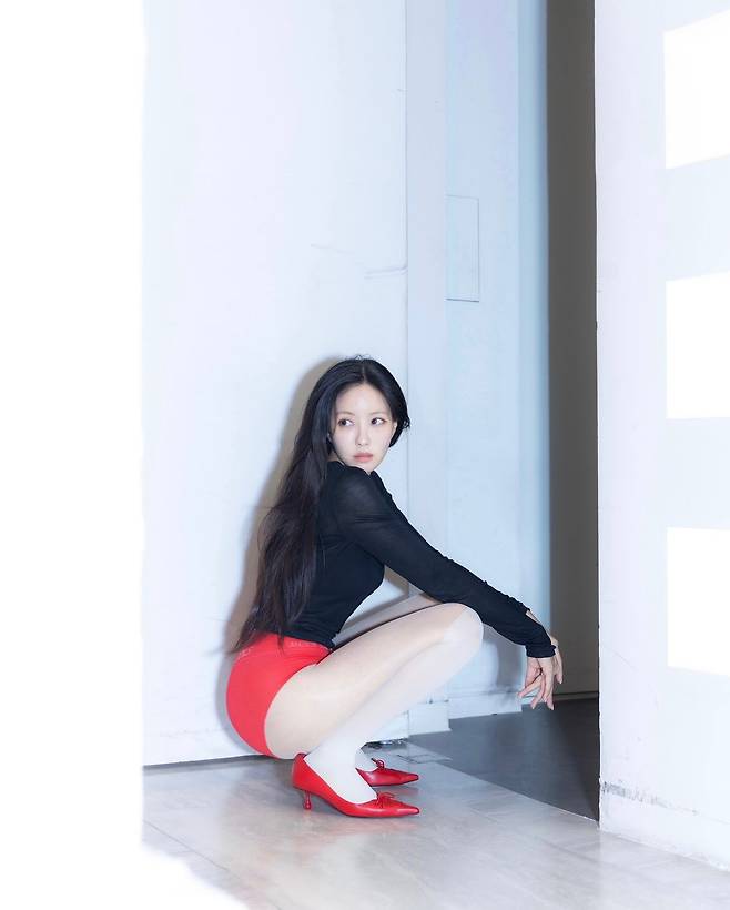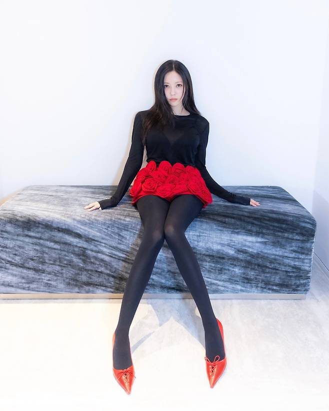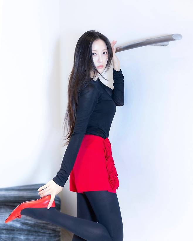 사진 속 효민은 블랙 티와 빨간색의 플라워 장식이 있는 미니스커트를 입고 빨간색 힐을 신어 날씬한 기럭지를 자랑했다. 또 다른 사진에서는 연두색 니트와 그레이 미니스커트를 입고 브라운 핸드백을 들었다.