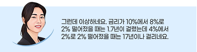 둘 다 금리가 2% 떨어졌지만, 실제로는 2%p 떨어진 겁니다. 10%에서 8%로 떨어진 것은 20% 떨어진 것이고, 4%에서 2%로 떨어진 것은 50%가 떨어진 겁니다. 그래서 내 돈을 2배로 만드는 데 걸리는 시간도 그만큼 차이가 나는 겁니다.