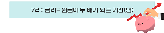 72의 법칙은 복리를 전제로 자산이 두 배로 늘어가는 데 걸리는 시간을 손쉽게 계산하는 방법입니다. 72를 해당 수익률로 나누면 대략 원금의 2배가 되는 기간이 산출될 수 있습니다.