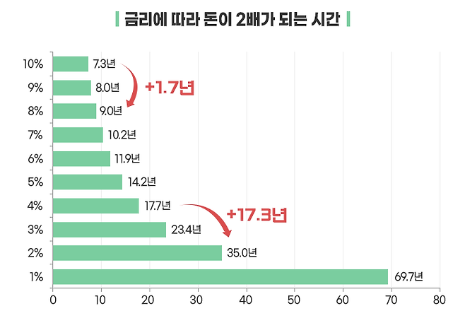 100만 원의 돈을 복리 상품에 투자한다고 해보겠습니다. 그래프에 따르면 금리가 10%이면 7.3년이 걸리고, 8%면 9년이 걸립니다. 금리가 10%에서 8%로 떨어지면 내 돈을 두 배로 만드는 데 1.7년이 더 걸리는 것입니다.
