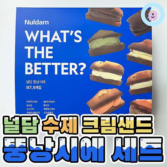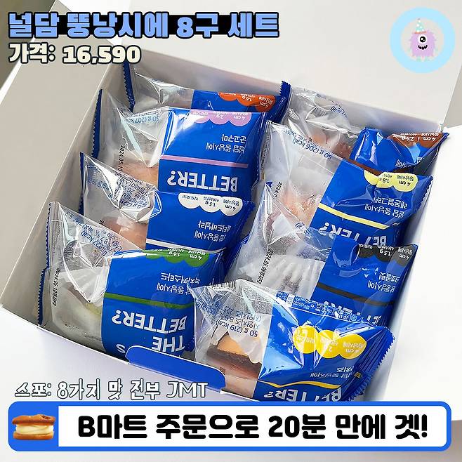 8가지 맛이 들어있는 8구 세트이고 가격은 16,590원이었답니다. 뚱낭시에 1개당 2천원 정도인 셈인데, 보통 카페에서 휘낭시에만 2500원~3500원인 것에 비하면 가성비가 내려오는 가격인 것 같아요. 뚱낭시에는 락토오보 제품인데다 크림까지 두툼하게 들어있거든요+_+/