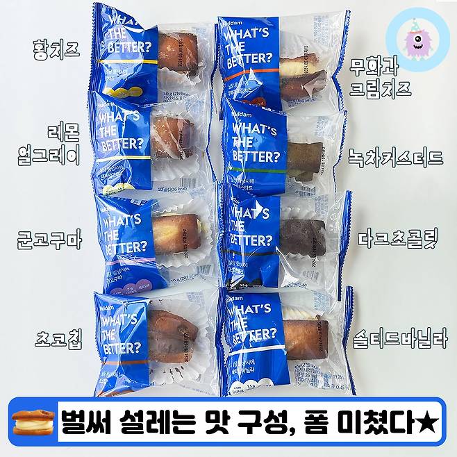 그리고 무화과나 초코칩이 박혀있거나, 고구마 무스가 한줄로 들어있거나, 레몬맛 설탕(?)이 뿌려져 있거나 8가지 맛 모두 디테일이 달라서 비주얼을 보는 재미도 낙낙하더라구요.