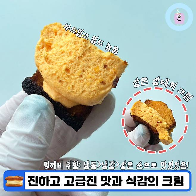 냉동실에서 꺼내자마자 먹으면 아이스크림 같은 재질이고, 냉장실에 보관했다가 먹으면 시원한 크림 휘낭시에를 먹는 느낌이었어요! 상온에 두면 크림이 녹는데 힘을 줘서 꾹 누르기 전까지는 계속해서 모양을 유지하고 있는 점이 상당히 신기했어요.