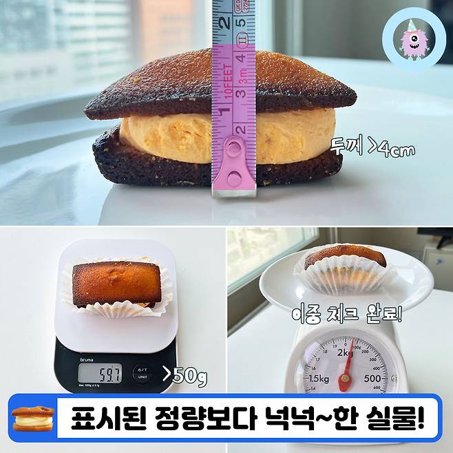 널담 뚱낭시에는 두께가 4cm인 것으로 유명해요! 몇 개를 무작위로 골라서 직접 측정해보니 전부 4cm 이상이었어요. 눈으로 보기에도 휘낭시에와 크림의 두께가 정말 이상적이지 않나요ㅎㅅㅎ