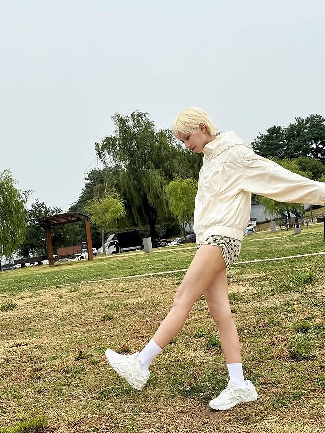 아이들의 전소연이 경쾌한 에너지가 담긴 공원룩으로 시선을 사로잡았다. 초여름의 흐린 하늘 아래, 풋풋한 잔디밭을 배경으로 발랄하게 포즈를 취한 그녀의 모습은 한 컷의 스트리트 화보처럼 감각적이다. 크림 컬러의 아노락과 쇼츠 조합은 이번 시즌 스포티 무드의 정수를 보여준다.